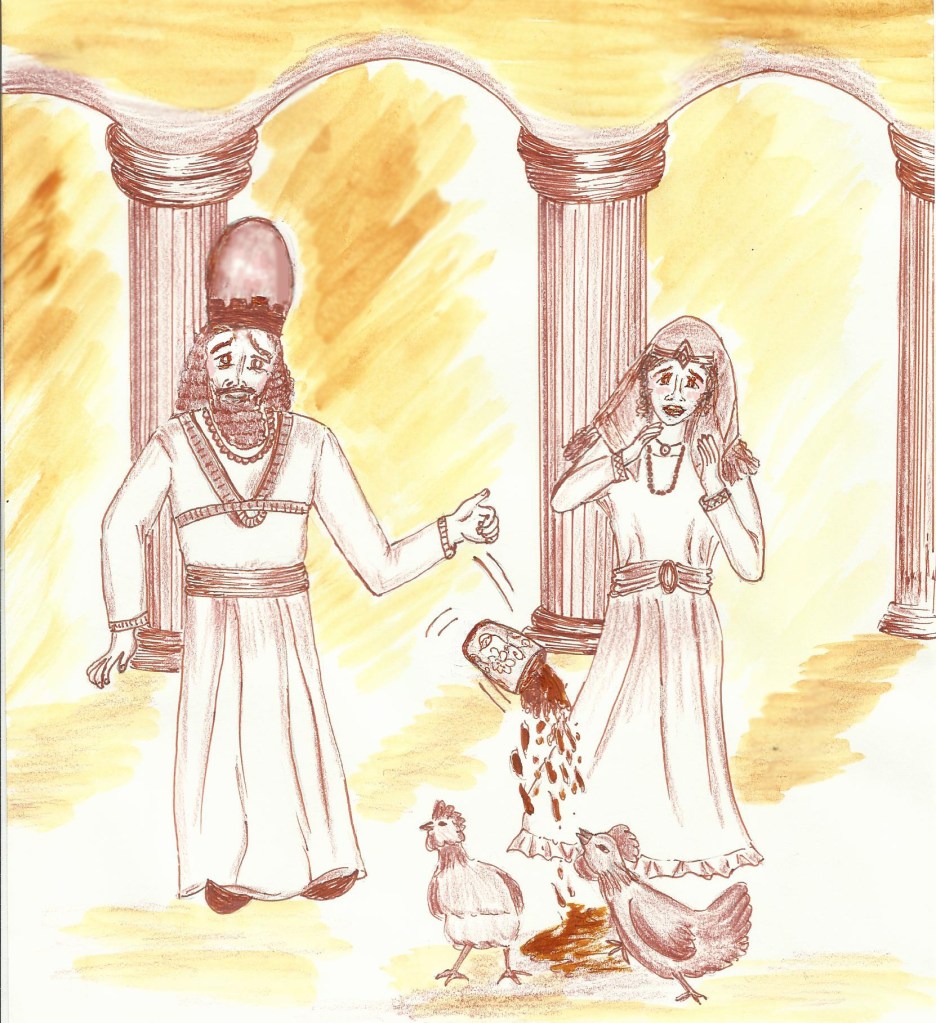 The sister was moved by the letter and decided to act accordingly. Once when Ardeshir returned from a hunt, she mixed the poison in his drink and gave it to him. Ardeshir, who was protected by the divine powers, was miraculously saved as the glass slipped from his hand and the drink spilt down. Hens which pecked at the drink died immediately. The king immediately realized that the queen had attempted to poison him. The queen started trembling.