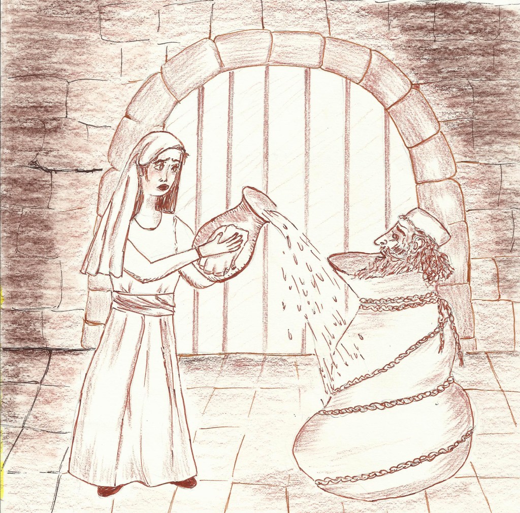 The next day the young princess went into the fort. She took the store room keys and sent a lot of food and wine to the rooms of all the senior courtiers and army commanders. Then she went to the wine-pourer and asked him to give the stiffest, undiluted wine to king Tāyar in the evening and keep pouring it till he was fast asleep.