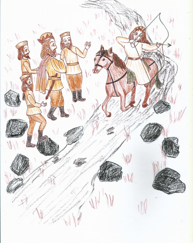 Gordiyeh displaying her skills by shooting an arrow from a running horse. King Khushru is watching. Illustration by: Mrs. Katie Bagli.